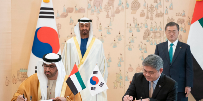 شهد صاحب السمو الشيخ محمد بن زايد آل نهيان ولي عهد أبوظبي نائب القائد الأعلى للقوات المسلحة وفخامة مون جاي إن رئيس جمهورية كوريا اليوم في البيت الأزرق مراسم توقيع اتفاقية ترسية عقد تنفيذ الأعمال الهندسية والمشتريات والتشييد بين شركة بترول أبوظبي الوطنية " أدنوك " وشركة " إس كي إنجنيرنغ آند كونستركشن " الكورية الجنوبية .. ولذلك لبناء أكبر مشروع منفرد في العالم تتم ترسيته لتخزين النفط بسعة تبلغ 42 مليون برميل من النفط الخام في إمارة الفجيرة ــ على الساحل الشرقي للدولة ــ بقيمة 4.4 مليار درهم.