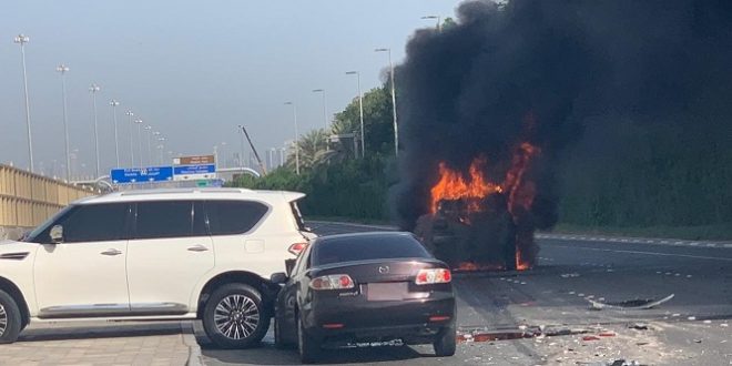 احترقت مركبة بالكامل في حادث تصادم ثلاث مركبات في أبوظبي بسبب عدم ترك مسافة كافية والانشغال بغير الطريق.