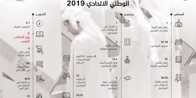 ضمن الجهود الحثيثة في إدارة العملية الانتخابية في دورتها الرابعة التي تتم في أكتوبر من العام الجاري، أعلنت اللجنة الوطنية للانتخابات اليوم تفاصيل الجدول الزمني لانتخاباتالمجلس الوطني الاتحادي 2019.