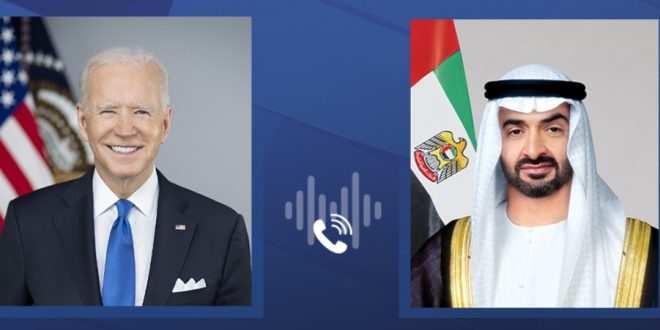 بحث صاحب السمو الشيخ محمد بن زايد آل نهيان رئيس الدولة "حفظه الله" خلال اتصال هاتفي مع فخامة جو بايدن رئيس الولايات المتحدة الأمريكية العلاقات الثنائية وتطورات الأوضاع في المنطقة.