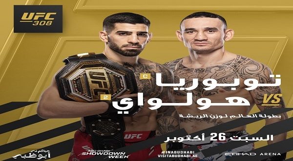 وتضم أجندة الفعالية مواجهة مرتقبة بين إثنين من أبرز مقاتلي الوزن المتوسط، المصنف الثالث روبرت ويتيكر والمصنف 11 حمزات شيماييف، في نزال سيستمر 5 جولات وسيلعب دوراً رئيسياً في تحديد حامل اللقب، وإلى جانب كونها الفعالية الثانية التي تستضيفها أبوظبي في عام 2024، تمثل بطولة "يو إف سي 308: توبوريا ضد هولواي" علامة فارقة باعتبارها الفعالية العشرين لمنظمة "يو إف سي" في دولة الإمارات على مدار العقد الماضي.