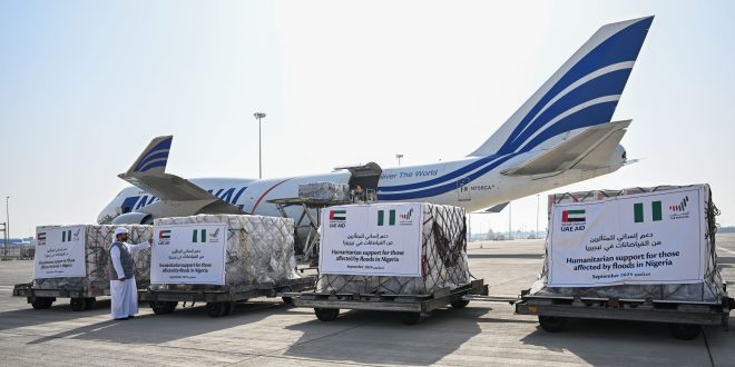 أرسلت دولة الإمارات، اليوم، طائرة تحمل على متنها 50 طناً من الإمدادات الغذائية إلى جمهورية نيجيريا الاتحادية، للتخفيف من معاناة السكان، الذين تأثروا بالفيضانات الأخيرة التي اجتاحت مناطق عديدة في نيجيريا.