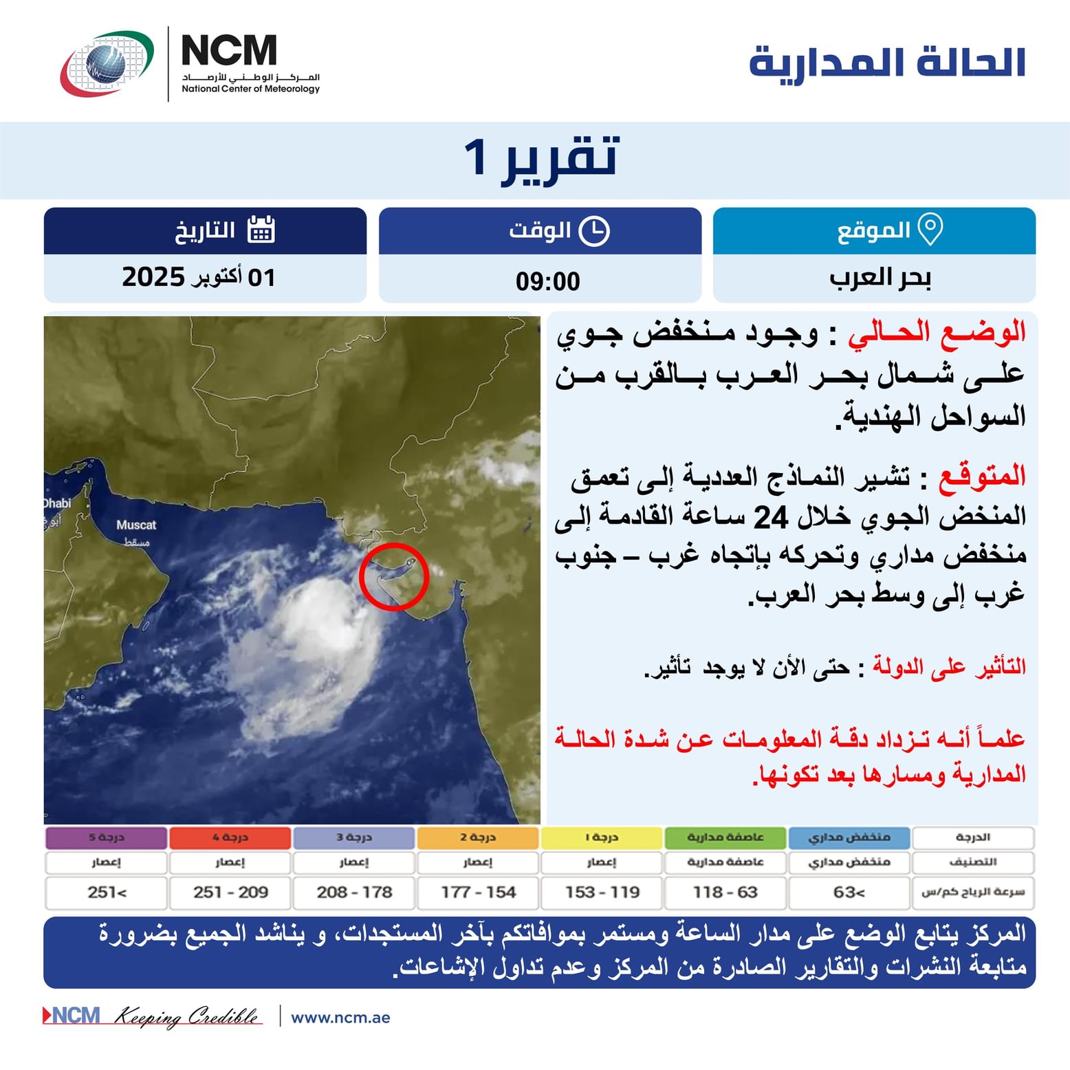 وأوضح المركز أن النماذج العددية تتوقع تعمق المنخفض خلال الـ24 ساعة القادمة ليتحول إلى منخفض مداري، مع تحركه باتجاه غرب – جنوب غرب نحو وسط بحر العرب.
