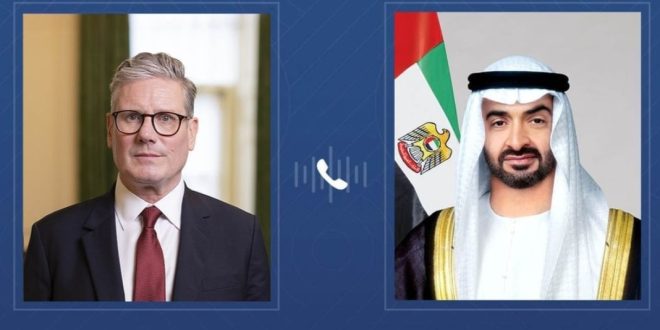 وأعرب صاحب السمو رئيس الدولة، خلال الاتصال، عن تقديره لاعتراف المملكة المتحدة بالدولة الفلسطينية، مشدداً على أن "حل الدولتين" هو المسار الأمثل لتحقيق الاستقرار في المنطقة لمصلحة دولها وشعوبها كافة.