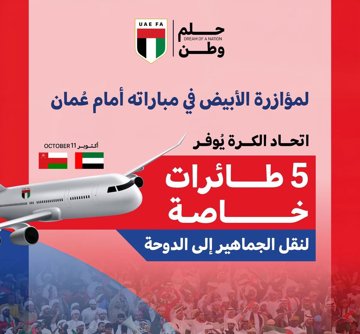 خصص اتحاد الإمارات لكرة القدم، 5 طائرات خاصة لنقل الجماهير إلى العاصمة القطرية الدوحة، لمساندة المنتخب الوطني الأول في مواجهته المرتقبة أمام نظيره العُماني يوم 11 أكتوبر الجاري على استاد حمد بن جاسم بنادي السد، ضمن الملحق الآسيوي المؤهل إلى نهائيات كأس العالم 2026.