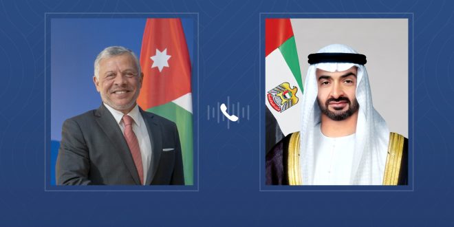 بحث صاحب السمو الشيخ محمد بن زايد آل نهيان رئيس الدولة “حفظه الله” مع أخيه صاحب الجلالة الملك عبدالله الثاني ابن الحسين ملك المملكة الأردنية الهاشمية الشقيقة، خلال اتصال هاتفي أمس، مختلف جوانب التعاون والعمل المشترك بين البلدين الشقيقين.