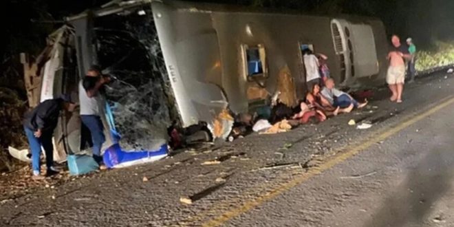 أسفر انقلاب حافلة ركاب كانت تقل حوالي 30 راكباً في ولاية بيرنامبوكو شمال شرق البرازيل، عن مصرع 17 شخصاً على الأقل، وإصابة آخرون.