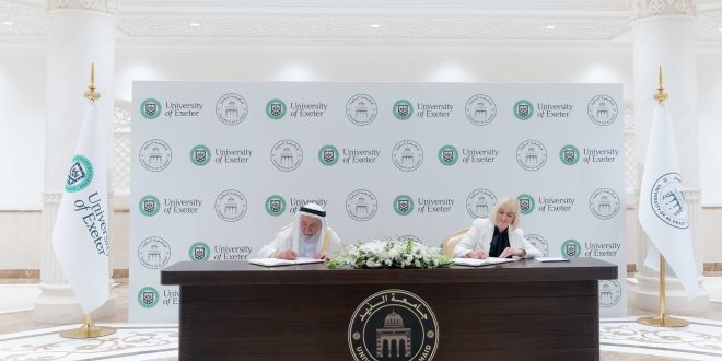 وقع صاحب السمو الشيخ الدكتور سلطان بن محمد القاسمي عضو المجلس الأعلى حاكم الشارقة رئيس جامعة الذيد، اليوم في مقر الجامعة، اتفاقية تعاون أكاديمي بين جامعة الذيد وجامعة إكستر البريطانية، والتي مثلتها رئيسة الجامعة الدكتورة ليزا روبرتس.
