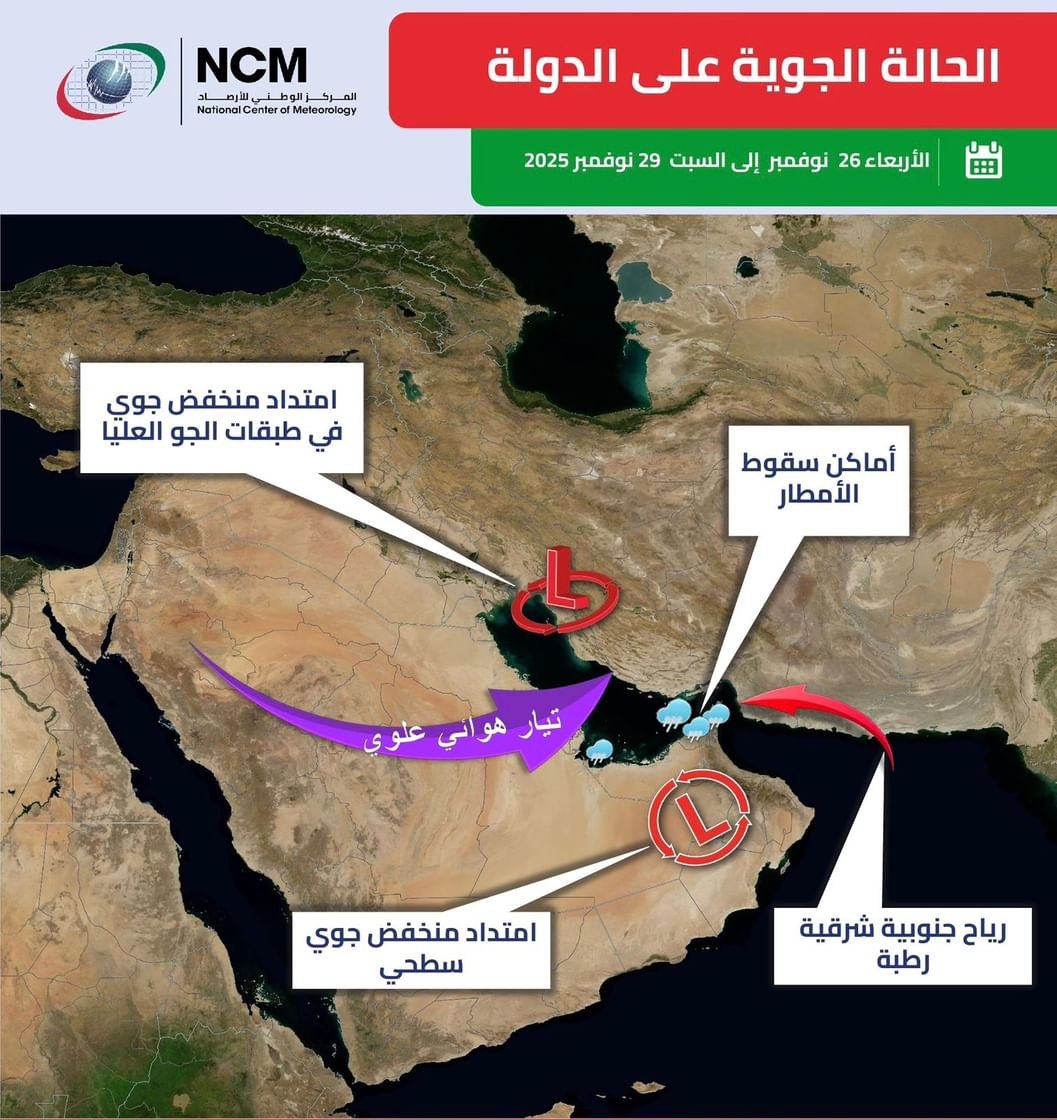 أفاد المركز الوطني للارصاد بأن الدولة تتأثر بداية من يوم غد الأربعاء إلى السبت الموافق 29 نوفمبر، بامتداد منخفض جوي سطحي من الجنوب الشرقي، مع امتداد منخفض جوي في طبقات الجو العليا، مصاحباً معه كتلة هوائية باردة وتيار هوائي علوي من الغرب، مما يؤدي إلى تطور السحب على بعض المناطق.
