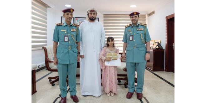 كرّم سعادة العميد سلطان خليفة المهيري، مدير عام الموارد والخدمات المساندة في القيادة العامة لشرطة عجمان، الطفلة شيماء علي في مركز شرطة مشيرف، تقديراً لأمانتها وحسن تصرفها، وذلك بحضور المقدم عبد الله الشيبة رئيس المركز، ووالد الطفلة.
