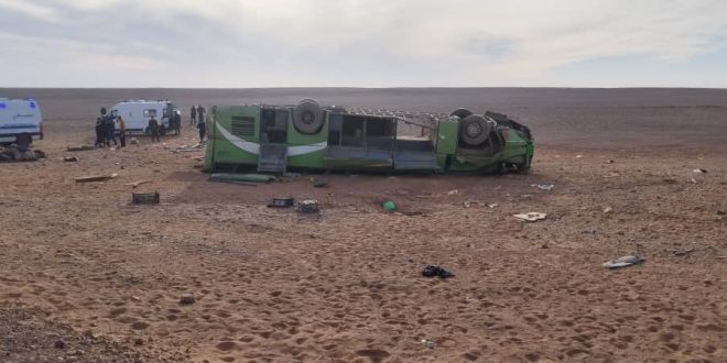 وأظهرت صور نشرتها وسائل إعلام محلية الحافلة منقلبة على سقفها إلى جانب طريق في بلدة تبلبالة، على بُعد نحو 400 كيلومتر جنوب مدينة بشار، في جنوب البلاد.