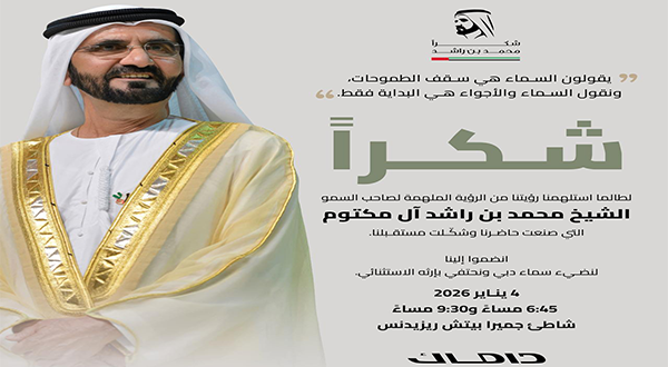 تحتفل "داماك" في الرابع من شهر يناير الحالي، بالذكرى العشرين لتولي سموه مقاليد الحكم في دبي، حيث ستضيء سماء دبي بعرضين ضوئيين مبهرين لآلاف الطائرات المسيّرة "الدرون"، التي سترسم لوحات فنية تجسد رحلة دبي من رمال الصحراء إلى أفق متألق بالعمران.