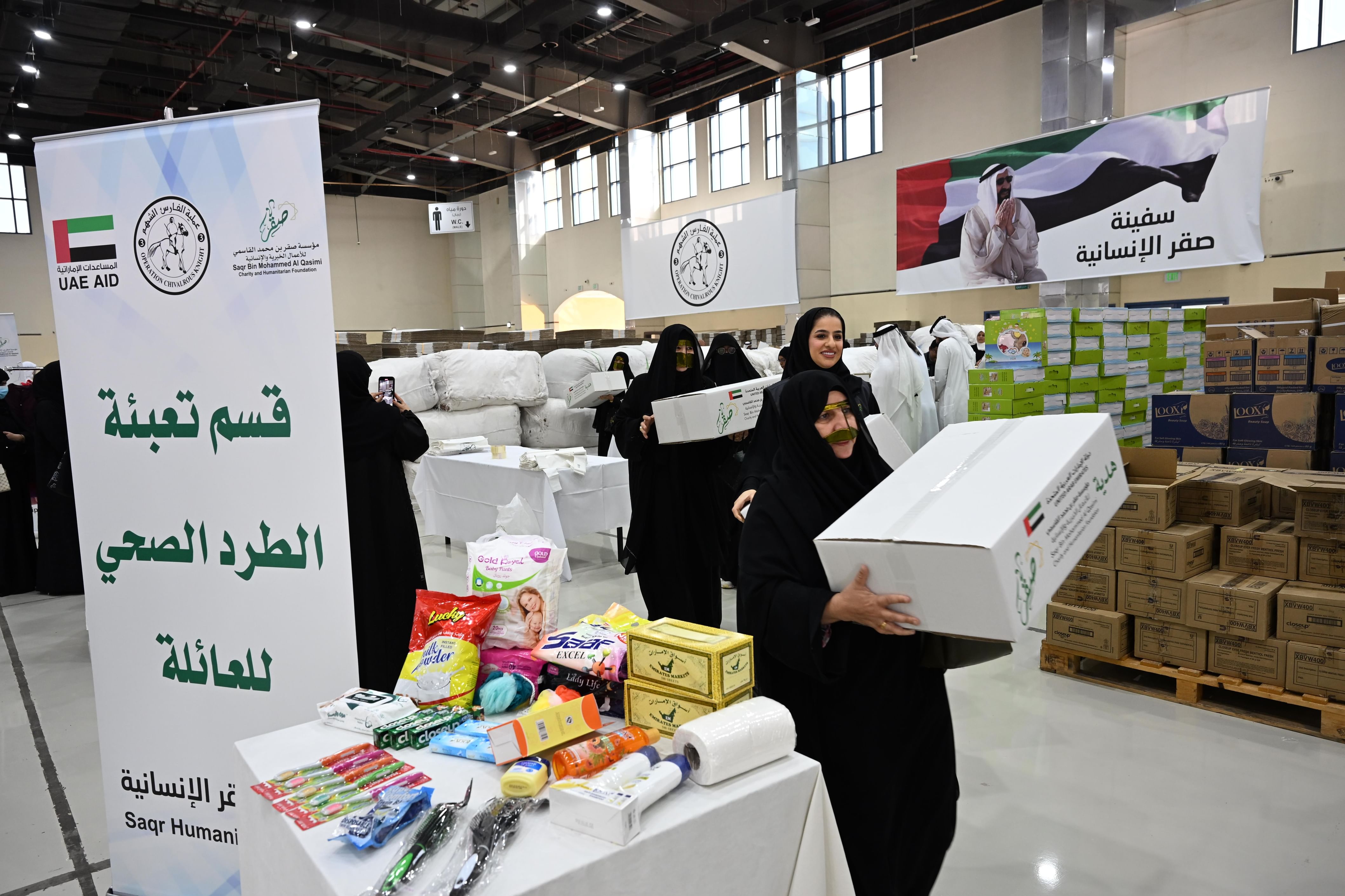 تنفيذاً لتوجيهات صاحب السمو الشيخ سعود بن صقر القاسمي، عضو المجلس الأعلى، حاكم رأس الخيمة، وبمتابعة وحضور الشيخ أحمد بن صقر القاسمي، رئيس مجلس أمناء مؤسسة صقر بن محمد القاسمي للأعمال الخيرية والإنسانية، باشرت المؤسسة اليوم أعمال تجهيز الطرود الإغاثية الخاصة بـ"سفينة صقر الإنسانية" في مركز رأس الخيمة للمعارض "إكسبو"، استعداداً لتحميلها على متن السفينة في مرحلة لاحقة، تمهيداً لتوجّهها إلى ميناء العريش في جمهورية مصر العربية لدعم الأشقاء في قطاع غزة.
