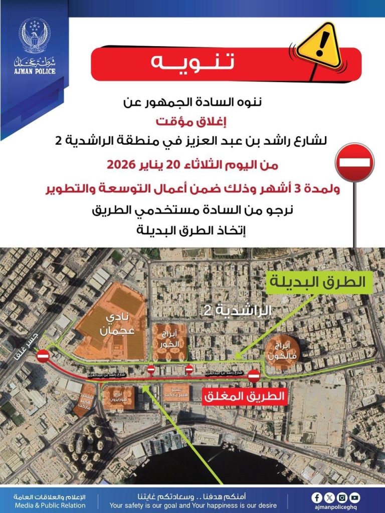 تعلن القيادة العامة لشرطة عجمان عن إغلاقٍ مؤقت لشارع راشد بن عبد العزيز في منطقة الراشدية (2)، وذلك ضمن أعمال التوسعة والتطوير، بالتعاون مع دائرة البلدية والتخطيط، اعتباراً اليوم 20 يناير 2026 ولمدة 3 أشهر، ويشمل المقطع الممتد من أبراج فالكون وحتى تقاطع جسر غلفا.