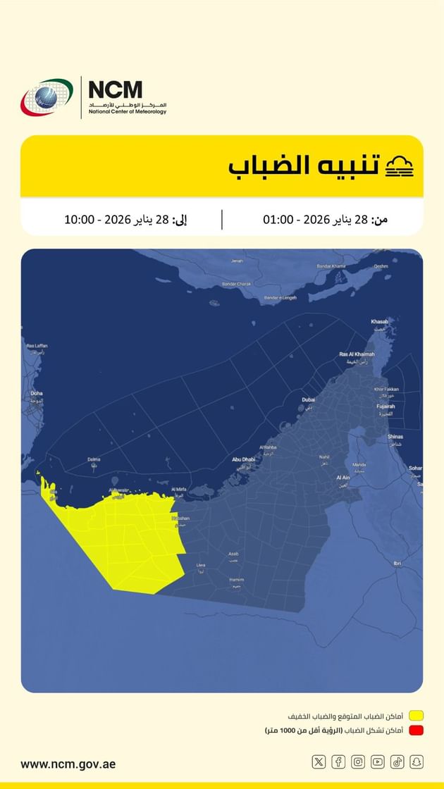 حذّر المركز الوطني للأرصاد من تشكل الضباب وتدني مدى الرؤية الأفقية، والتي قد تنعدم أحياناً على بعض المناطق الداخلية والساحلية، خاصة المناطق الغربية من الدولة، وذلك اعتباراً من الساعة 01:00 وحتى الساعة 10:00 من صباح يوم غد الأربعاء.