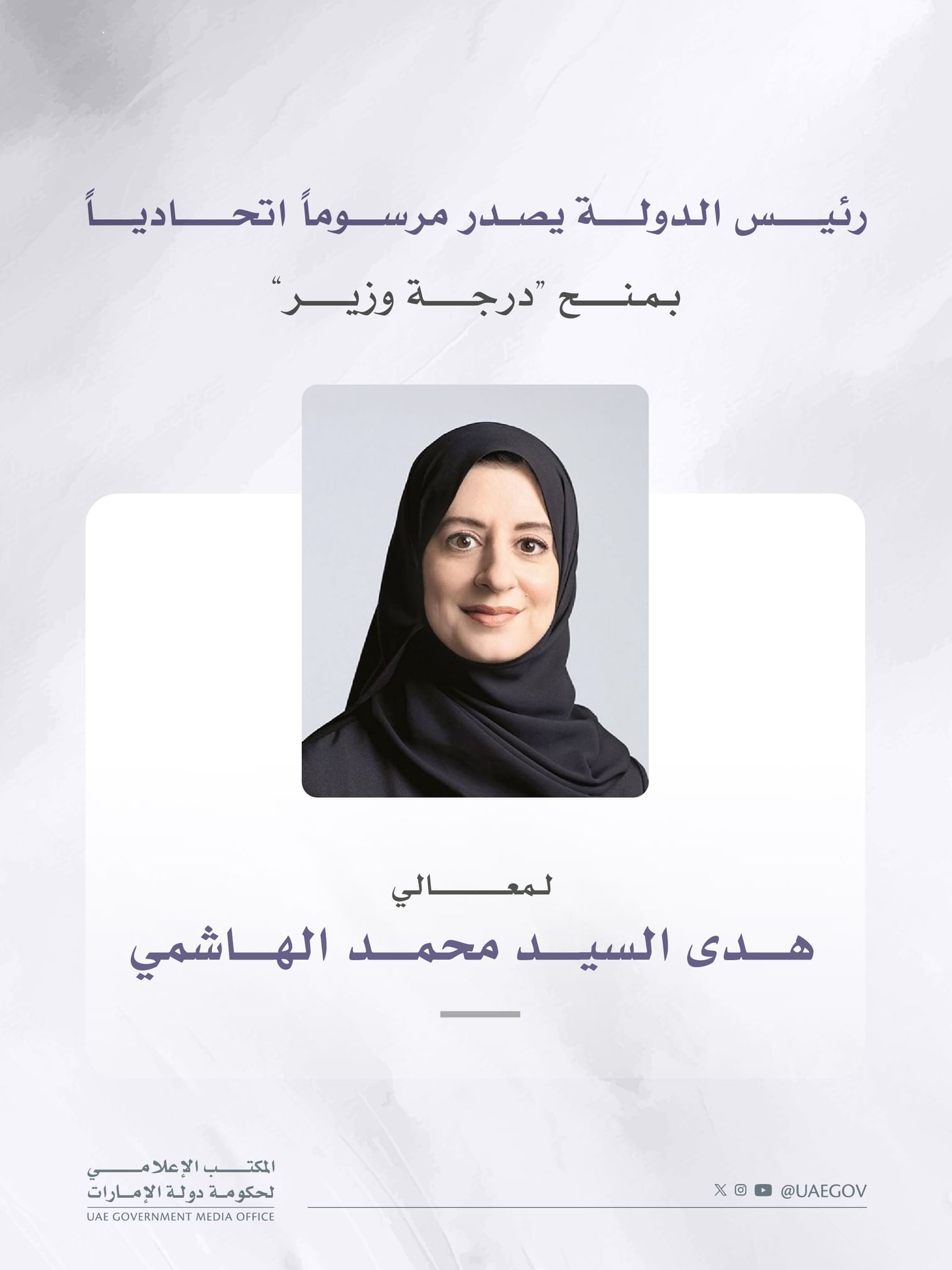 أصدر صاحب السمو الشيخ محمد بن زايد آل نهيان، رئيس الدولة، حفظه الله، مرسوماً اتحادياً بشأن منح معالي هدى السيد محمد الهاشمي "درجة وزير"، على أن يعمل بهذا المرسوم من تاريخ صدوره، وينشر في الجريدة الرسمية.