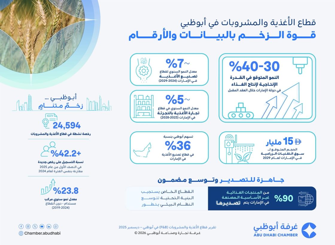 ويُعد التقرير أول إصدار قطاعي ضمن إستراتيجية غرفة أبوظبي للأعوام 2025–2028، حيث يسلط الضوء على التوسع المتواصل في القدرات الإنتاجية، وارتفاع إمكانات التصدير، وتطور منظومة الابتكار، بما يعزز مكانة أبوظبي كأحد أكثر الاقتصادات الغذائية تنافساً ومرونة على مستوى المنطقة.