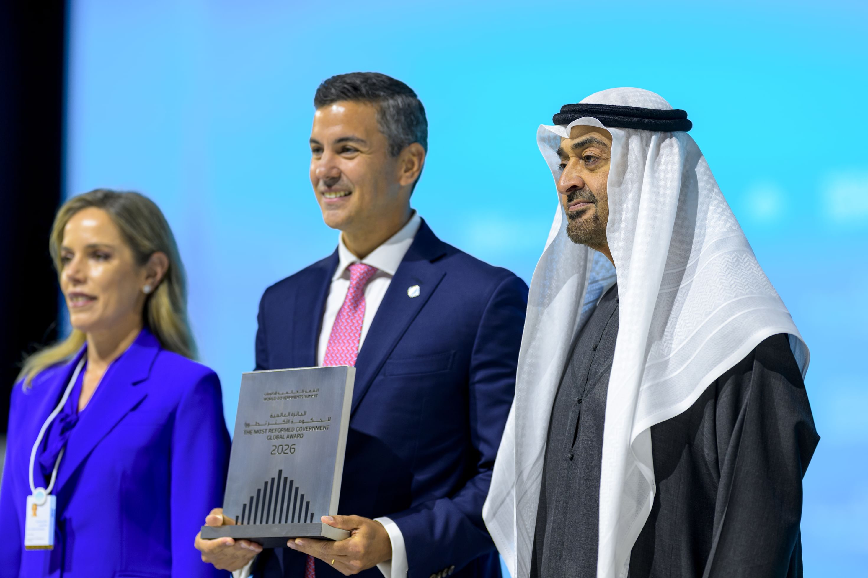 سلّم صاحب السمو الشيخ محمد بن زايد آل نهيان، رئيس الدولة "حفظه الله"، فخامة سانتياغو بينيا بالاسيوس، رئيس جمهورية الباراغواي، الجائزة العالمية للحكومات الأكثر تطوراً، إحدى أرفع الجوائز التي تُمنح ضمن القمة العالمية للحكومات، وذلك خلال فعاليات القمة المنعقدة في دبي خلال الفترة من 3 إلى 5 فبراير الحالي، بمشاركة عالمية رفيعة المستوى.