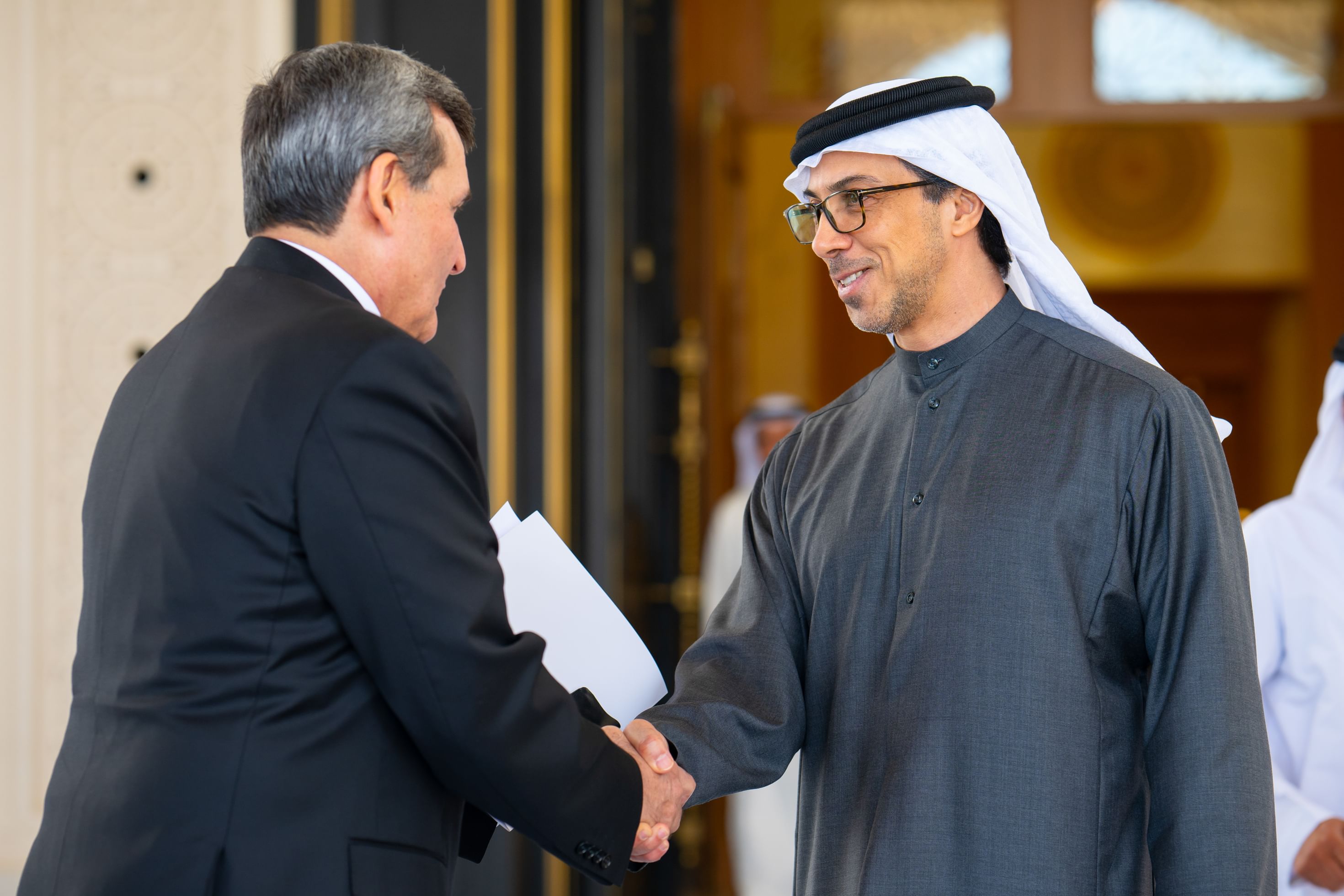 استقبل سمو الشيخ منصور بن زايد آل نهيان، نائب رئيس الدولة، نائب رئيس مجلس الوزراء، رئيس ديوان الرئاسة، اليوم، بقصر الوطن في أبوظبي، معالي رشيد ميردوف، نائب رئيس مجلس الوزراء وزير الخارجية في جمهورية تركمانستان.