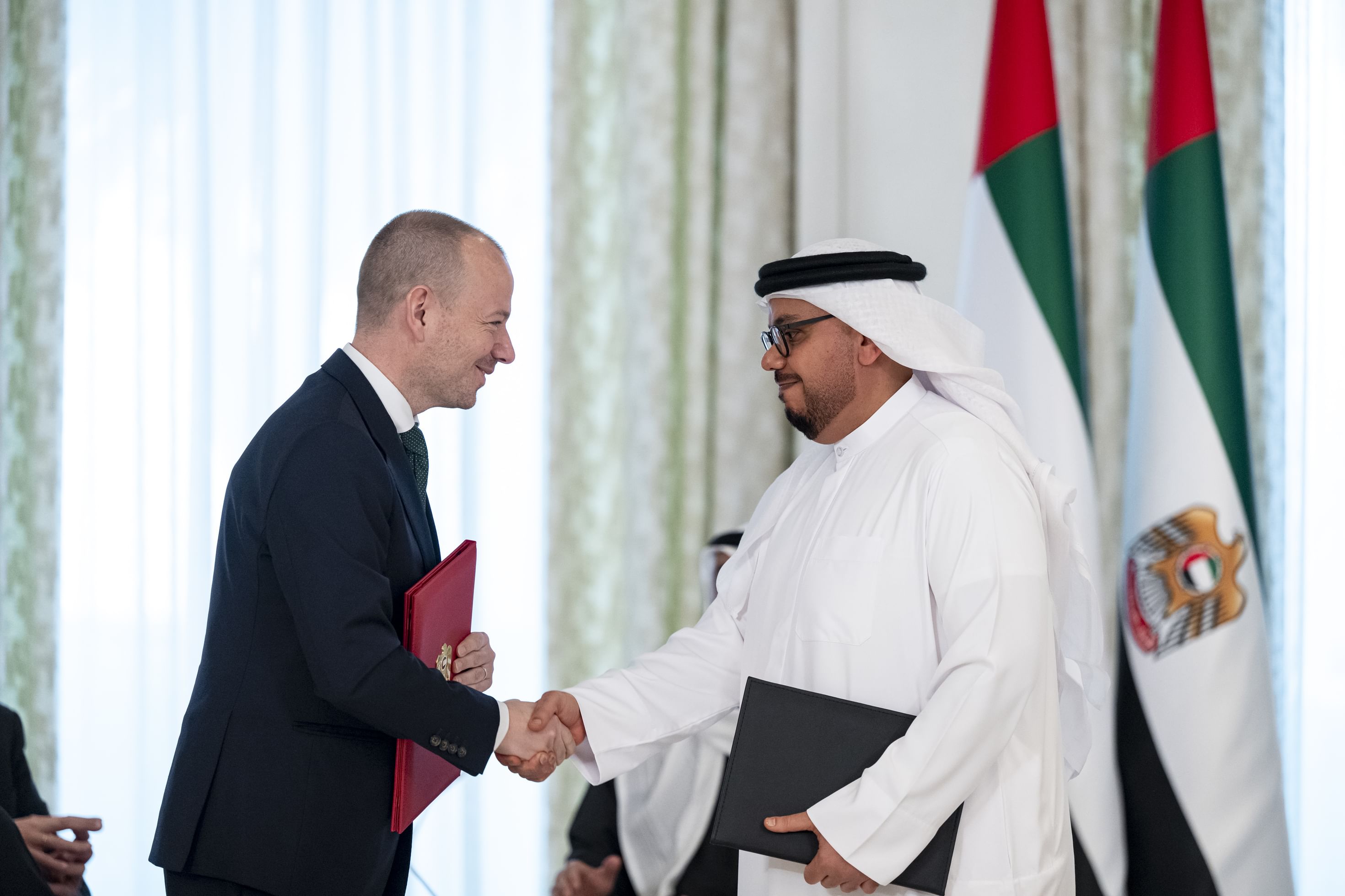 وشهد صاحب السمو رئيس الدولة والمستشار الألماني الإعلان عن عدد من مذكرات التفاهم وتبادلها، والتي تهدف إلى توسيع مجالات التعاون بين البلدين في قطاعات حيوية، شملت التعاون في مجالات الغاز والغاز الطبيعي المسال، ونظم بطاريات تخزين الطاقة، والصناعات الكيماوية، إضافة إلى التعاون الرياضي بين رابطة المحترفين الإماراتية والدوري الألماني، بما يعكس تنوع الشراكة الثنائية وعمقها.