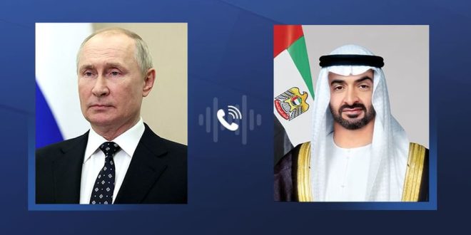 بحث صاحب السمو الشيخ محمد بن زايد آل نهيان رئيس الدولة "حفظه الله" وفخامة فلاديمير بوتين رئيس روسيا الاتحادية خلال اتصال هاتفي مختلف جوانب التعاون والعمل المشترك وفرص تعزيزهما في إطار الشراكة الإستراتيجية التي تجمع البلدين بما يخدم مصالحهما المتبادلة.