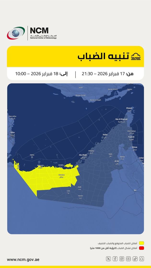 حذّر المركز الوطني للأرصاد من فرصة تشكل الضباب وتدنّي مدى الرؤية الأفقية، قد تصل أحياناً إلى انعدامها على بعض المناطق الغربية من الدولة، وذلك ابتداءً من الساعة 21:30 مساء اليوم وحتى الساعة 10:00 من صباح يوم غد الأربعاء، في ظل ظروف جوية تساعد على تكوّن الضباب الكثيف خلال ساعات الليل والصباح الباكر.