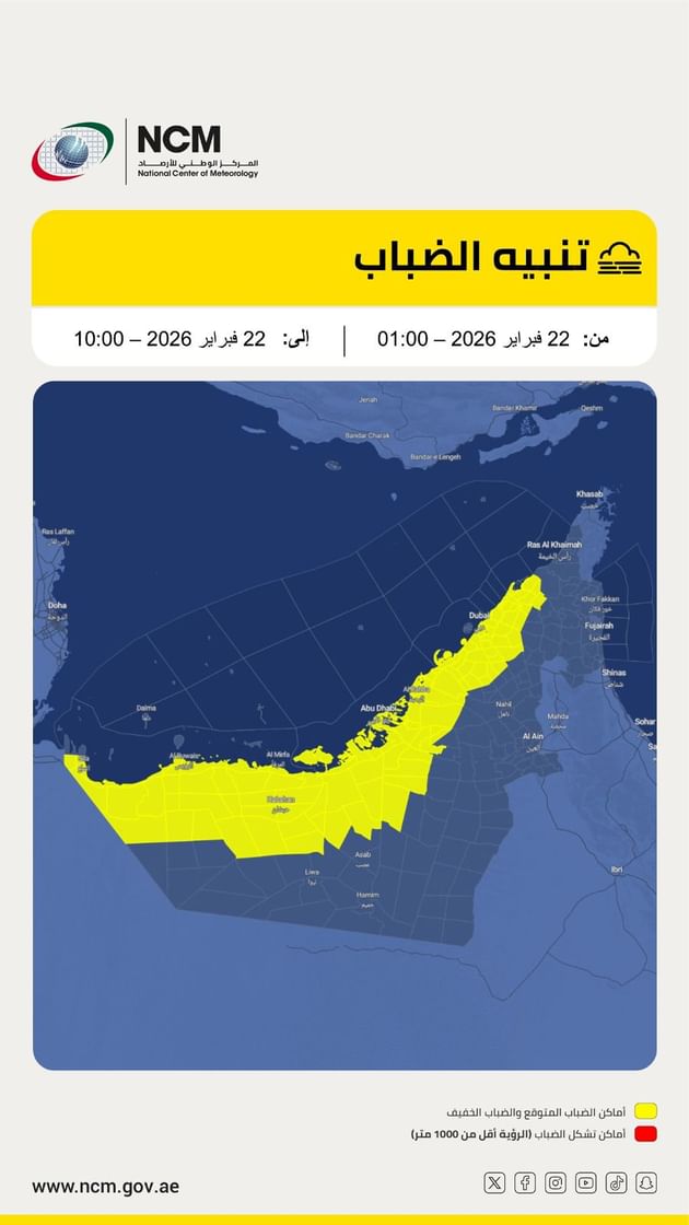 حذّر المركز الوطني للأرصاد من فرصة تشكّل الضباب وتدنّي مدى الرؤية الأفقية، التي قد تنعدم أحياناً على بعض المناطق الساحلية والداخلية، وذلك خلال الفترة من الساعة 01:00 وحتى الساعة 10:00 من صباح الأحد.