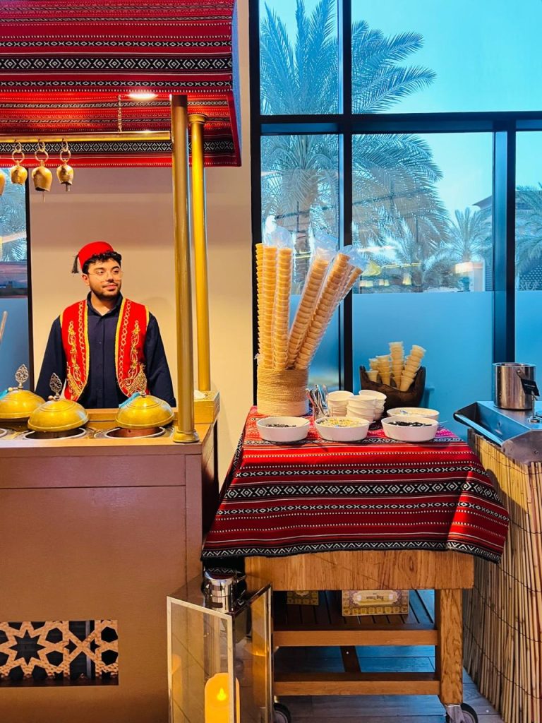 كما يبرز ركن الحلويات الإماراتية ذات الطابع البيتي الذي تم تطويره بالتعاون مع الشيف فاطمة، شيف الحلويات الإماراتية في المنتجع والمتخصصة في الحلويات المحلية والعالمية والوصفات التقليدية المحضّرة داخل المطبخ، احتفاءً بالحرفية والتراث ويضيف ركن الكنافة لمسة حسية مميزة، حيث تُقدَّم الكنافة طازجة وساخنة طوال الأمسية.