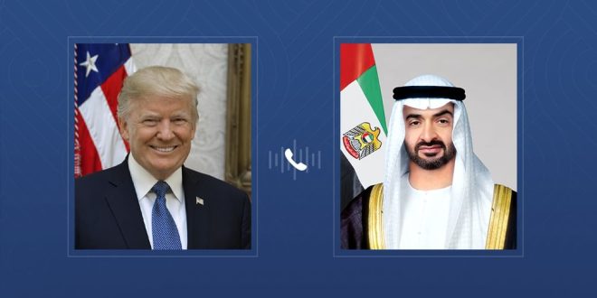 تلقى صاحب السمو الشيخ محمد بن زايد آل نهيان رئيس الدولة "حفظه الله" اتصالاً هاتفياً من فخامة دونالد ترامب رئيس الولايات المتحدة الأميركية.. بحثا خلاله الاعتداءات الإيرانية السافرة على أراضي دولة الإمارات وعدد من الدول الشقيقة في المنطقة.