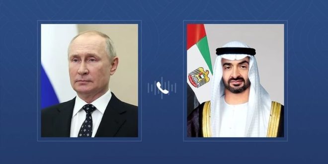 ودعا صاحب السمو رئيس الدولة وفخامة الرئيس الروسي، خلال الاتصال، إلى الوقف الفوري للتصعيد العسكري لتجنب توسيع الصراع في المنطقة وتغليب لغة الحوار والحلول السياسية في معالجة مختلف القضايا.