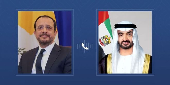 تلقى صاحب السمو الشيخ محمد بن زايد آل نهيان رئيس الدولة "حفظه الله" اليوم اتصالاً هاتفياً من فخامة نيكوس خريستودوليدس رئيس جمهورية قبرص، تناول التداعيات الخطيرة للتصعيد العسكري الذي تشهده المنطقة على الأمن والاستقرار الإقليميين.