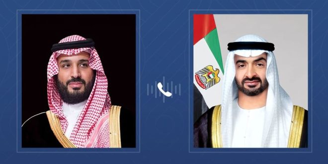 تلقى صاحب السمو الشيخ محمد بن زايد آل نهيان رئيس الدولة "حفظه الله"، اليوم، اتصالاً هاتفياً من أخيه صاحب السمو الملكي الأمير محمد بن سلمان بن عبد العزيز آل سعود ولي العهد رئيس مجلس وزراء المملكة العربية السعودية الشقيقة.. بحثا خلاله التطورات التي تشهدها المنطقة إثر الأعمال العسكرية المتصاعدة وما تنطوي عليه من تداعيات خطيرة على الأمن والاستقرار الإقليمي والدولي.