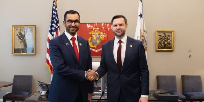 استقبل معالي جي دي فانس، نائب الرئيس الأمريكي اليوم الأربعاء، معالي الدكتور سلطان أحمد الجابر، وزير الصناعة والتكنولوجيا المتقدمة، العضو المنتدب والرئيس التنفيذي لأدنوك ومجموعة شركاتها، في البيت الأبيض بالعاصمة الأمريكية واشنطن.