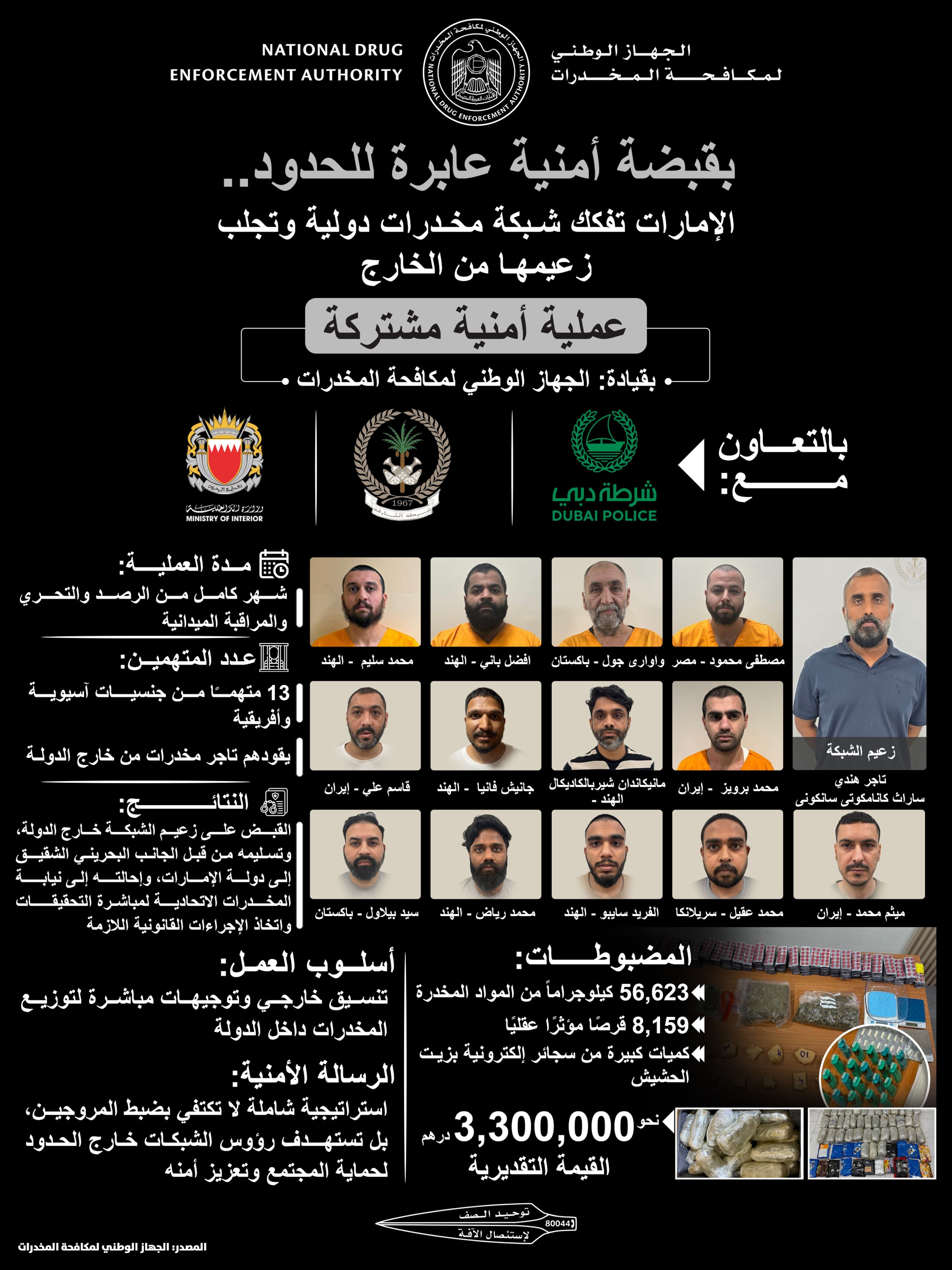 نجح الجهاز الوطني لمكافحة المخدرات في دولة الإمارات العربية المتحدة، في تنفيذ عملية مشتركة مع شرطة دبي، والشارقة ومملكة البحرين استمرت لمدة شهر، أسفرت عن ضبط عصابة إجرامية مكونة من 13 متهماً يحملون الجنسية الآسيوية والأفريقية، يقودها تاجر مخدرات من الجنسية الأسيوية من خارج الدولة، مختصة في ترويج المواد المخدرة .
