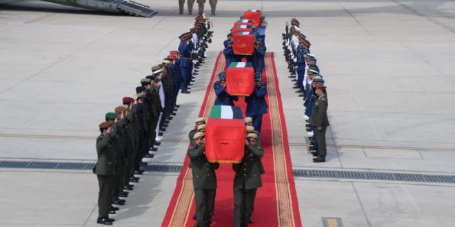 The martyrs are Captain Saeed Ahmed Rashid Al Mansouri; Warrant Officer Ali Abdullah Ahmed Al Dhanhani; Warrant Officer Zayed Musllam Suhail Al Amri; Warrant Officer Saleh Hassan Saleh bin Amro; Warrant Officer Nasser Mohamed Hamad Al Kaabi, and Sergeant Saif Dhawi Rashid Al Tunaiji.