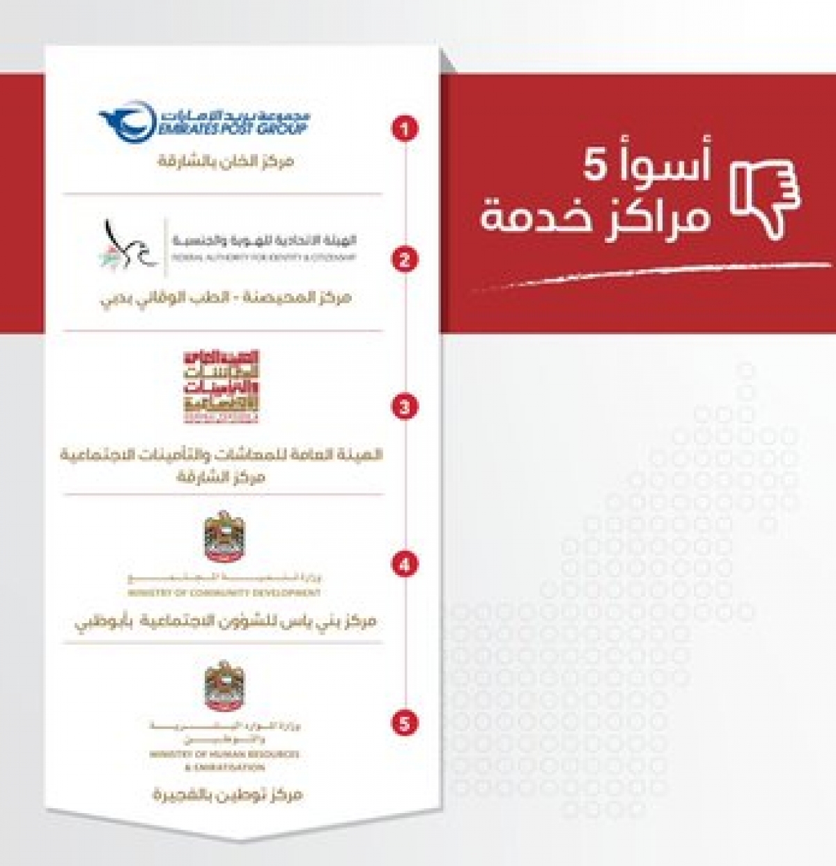 On his twitter page, Sheikh Mohammed bin Rashid: “Brothers and Sisters … Today I received a comprehensive assessment report on the level of services in 600 government service centers in UAE.. We promised to announce the 5 least & best performing service centers”. The best performing service center was in Fujairah, belonging to the Federal Authority for Identity and Citizenship, while the lowest-performing center was the Emirates Post-Al Khan Branch, Sharjah.