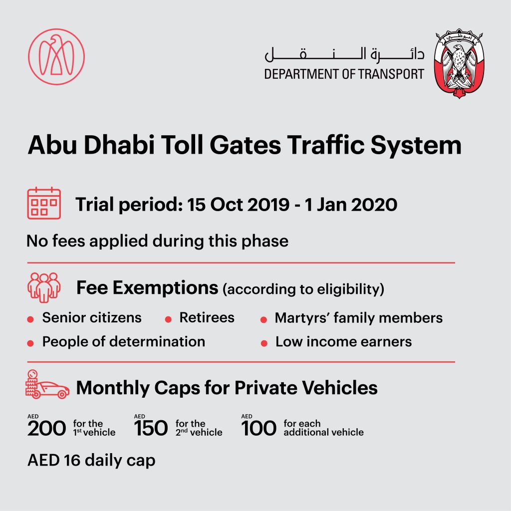 Department of Transport in Abu Dhabi announced that the Abu Dhabi Traffic Toll Gate System will commence on 15 Oct 2019 on a free of charge basis until 1 Jan 2020. This trial period will provide residents more time to plan the best travel times and explore transport alternatives.
