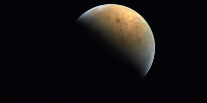The colour is created from a composite of red, green, and blue EXI images. The North pole of Mars is in the upper left of the image. EMM captured the largest volcano in the solar system, Olympus Mons (centre), emerging into the early morning sunlight.