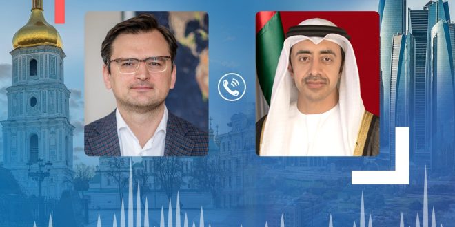 H.H. Sheikh Abdullah bin Zayed Al Nahyan, Minister of Foreign Affairs and International Cooperation, has discussed with Ukraine’s Foreign Minister, Dmytro Kuleba, a number of regional and international issues and the latest developments in Ukraine.
